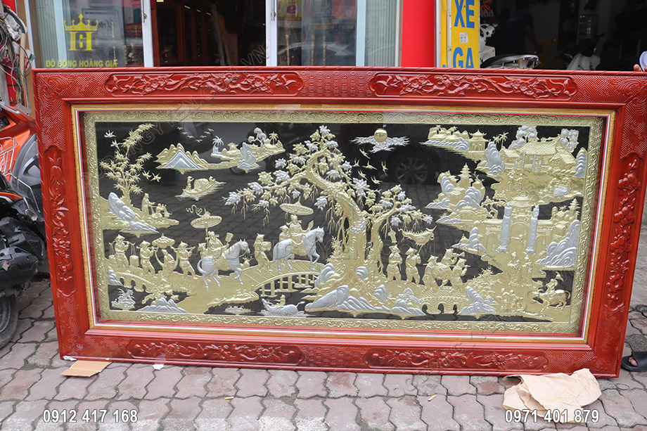 Bức Tranh Vinh Quy Bái Tổ Mạ Vàng Bạc 2m3 Cho Khách Ở Hòa Bình của đồ đồng Hoàng gia là bức tranh đồng mỹ nghệ được chạm thúc hoàn toàn thủ công trên tấm đồng vàng dày 8 rem, khung bằng gỗ tự nhiên vô cùng chắc chắn. Tranh thường được treo tại không gian phòng khách, phòng làm việc, thư phòng hay tại sảnh lớn.