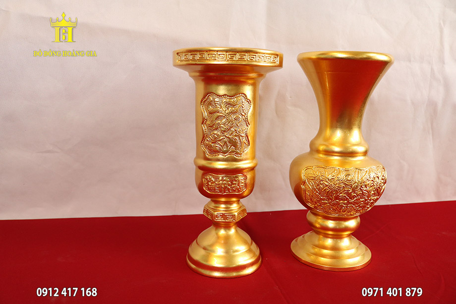 Cặp lọ hoa ống hương bằng đồng dát vàng 9999 của Đồ Đồng Hoàng Gia là những vật phẩm không thể thiếu trên ban thờ gia tiên, thể hiện tấm lòng biết ơn của gia chủ.
