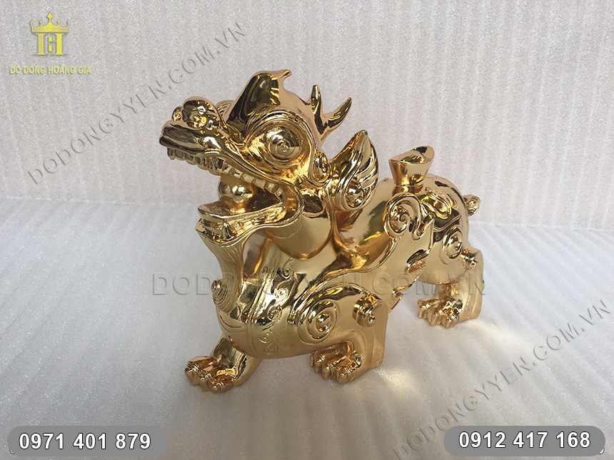 Tỳ Hưu Mạ Vàng 24K cao cấp kích thước dài 31cm, cao 23cm, nặng 10kg được đúc bằng nguyên liệu đồng vàng nguyên chất